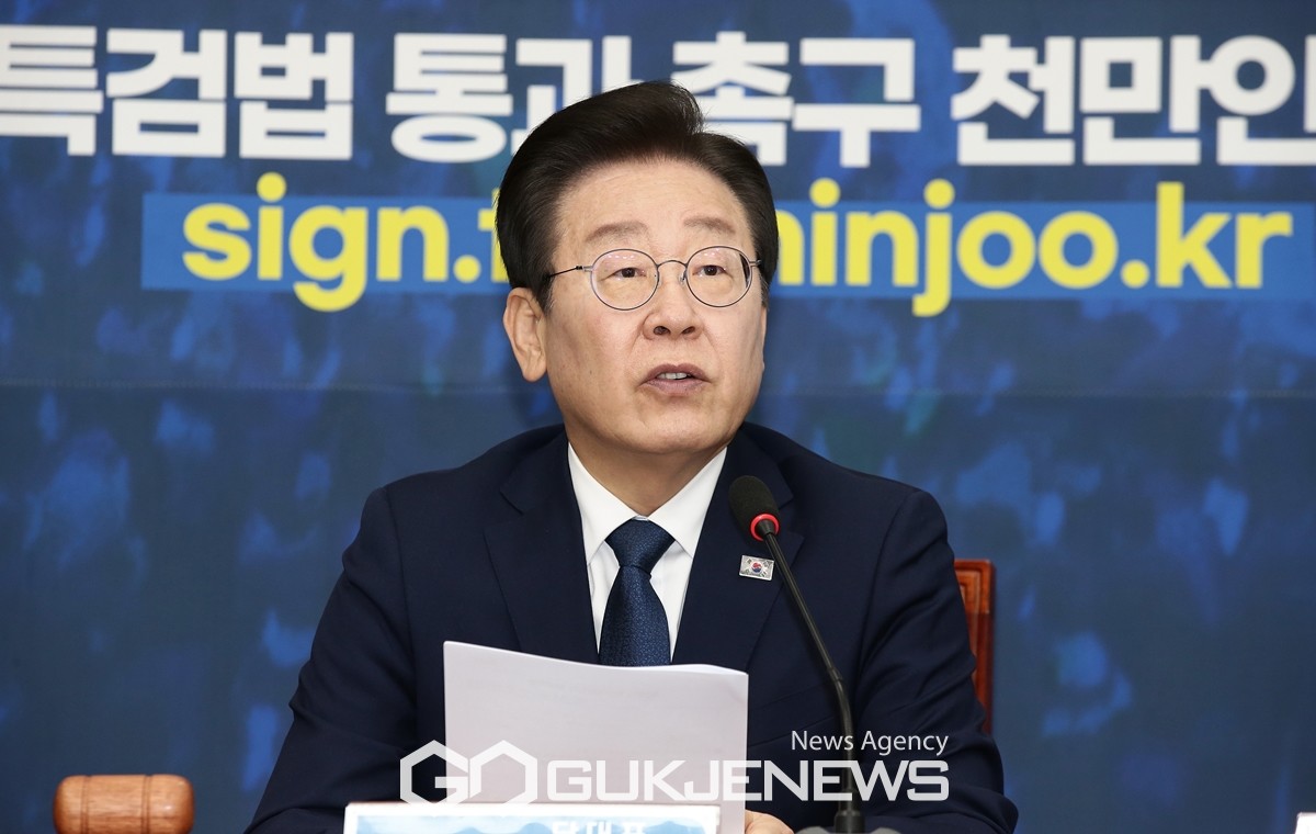 (서울=국제뉴스) 이재명 더불어민주당 대표가 25일 서울 여의도 국회에서 열린 최고위원회의에서 모두발언을 하고 있다. /사진=원명국 기자