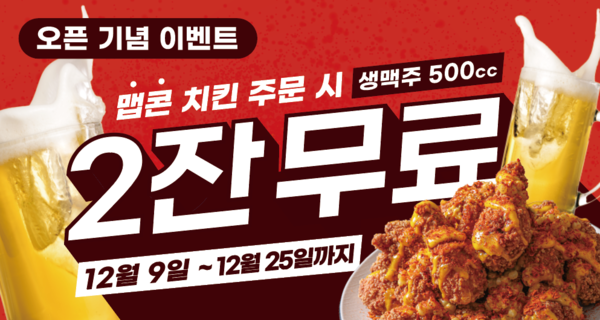 또한, 이달 9일부터 25일까지 치킨파머스의 출시 예정 신메뉴 '맵콘치킨'을 주문하면 생맥주 2잔을 무료로 제공하는 이벤트를 함께 진행하고 있다.