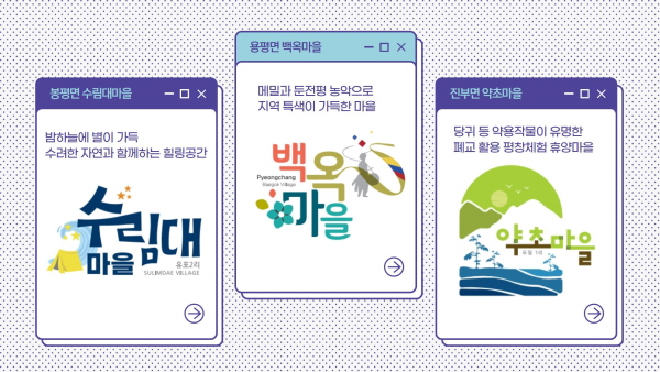 군은 지난 6월 공고를 통해 브랜드 개발을 희망하는 3개 마을(봉평면 유포2리 수림대마을, 용평면 백옥포1리 백옥마을, 진부면 두일1리 약초마을)을 선정했다. 이후 마을별 회의를 통해 지역의 마을 이야기를 발굴하고, 지역을 대표할 수 있는 이미지에 대해 논의한 끝에 컨소시엄 도시인 충주시와의 협업으로 각 마을의 브랜드 로고를 개발했다.