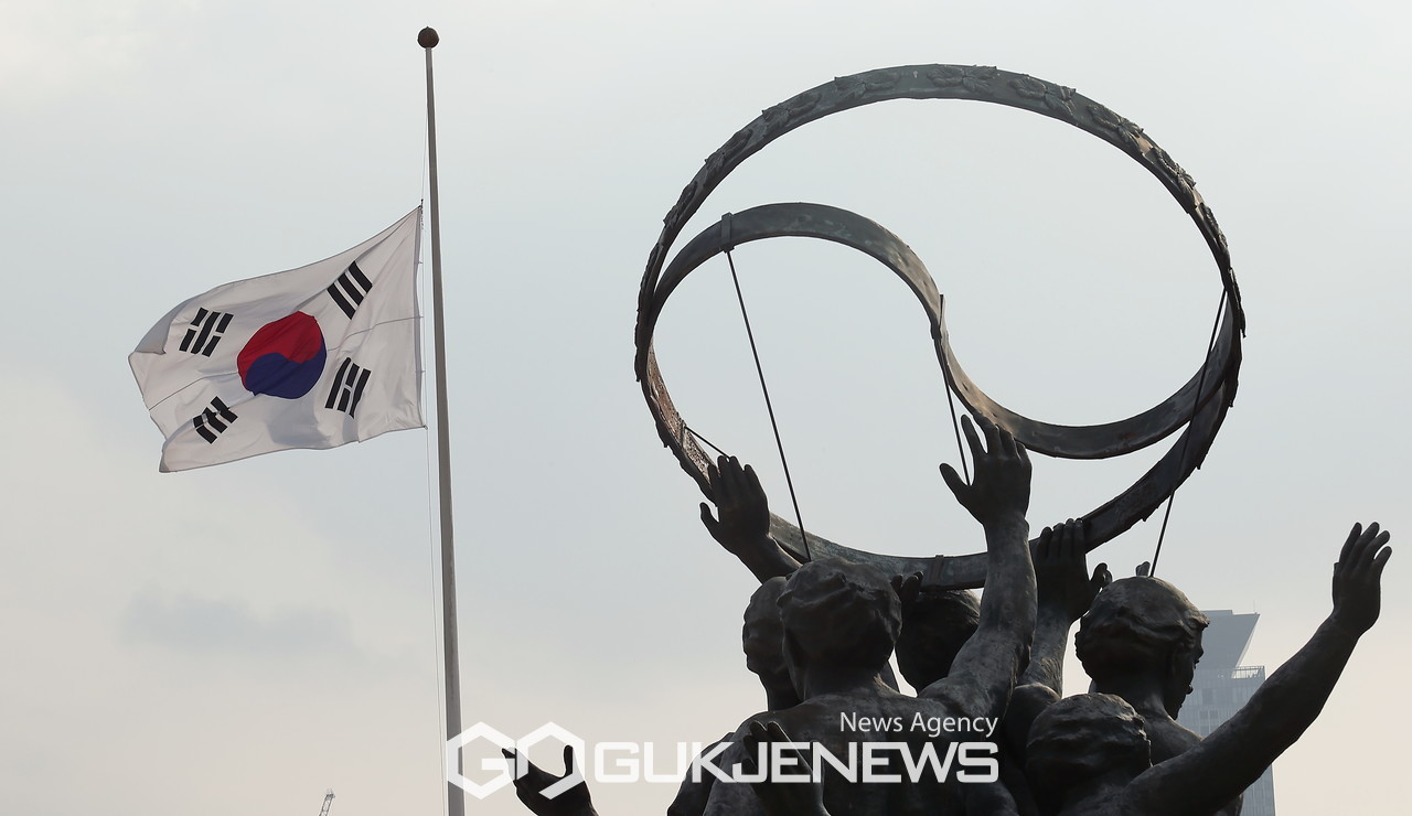 (서울=국제뉴스) 30일 오전 서울 여의도 국회의사당에 제주항공 여객기 참사 희생을 애도하는 조기가 걸려 있다. /사진=원명국 기자
