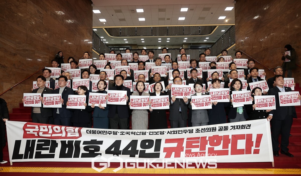 (서울=국제뉴스) 더불어민주당·조국혁신당·진보당·사회민주당 초선 의원들이 7일 오후 서울 여의도 국회 로텐더홀 계단에서 기자회견을 열어 윤석열 대통령에 대한 체포영장 집행을 저지하기 위해 한남동 관저 앞을 지켰던 44명의 국민의힘 의원들을 규탄하고 있다. /사진=원명국 기자