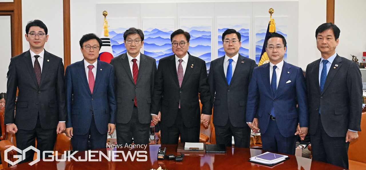 (서울=국제뉴스) 우원식 국회의장이 17일 서울 여의도 국회에서 열린 국회의장 주재 여야 원내대표 회동 시작에 앞서 기념촬영을 하고 있다. 사진 왼쪽부터 주진우 국민의힘 의원·박형수 원내수석부대표·권성동 원내대표, 우 의장, 박찬대 더불어민주당 원내대표·박성준 원내수석부대표·박균택 의원./사진=이용우기자