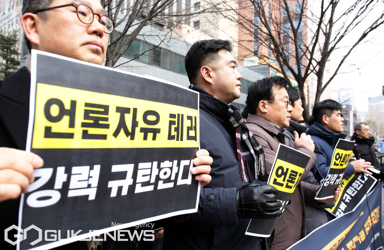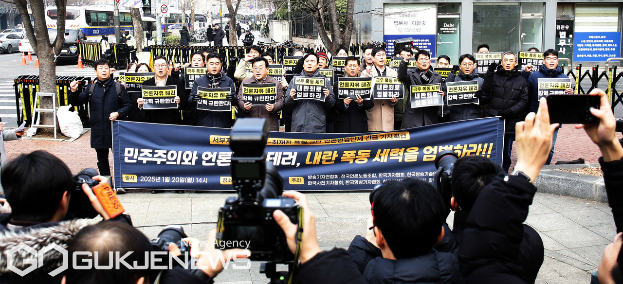 (서울=국제뉴스) 한국기자협회와 한국사진기자협회 등으로 구성된 언론현업단체원들이 20일 오후 서울 마포구 서울서부지방법원 앞에서 서부지법 극우폭동·취재진 폭행 규탄 언론현업단체 긴급 기자회견을 열고 구호를 외치고 있다./사진=이용우기자