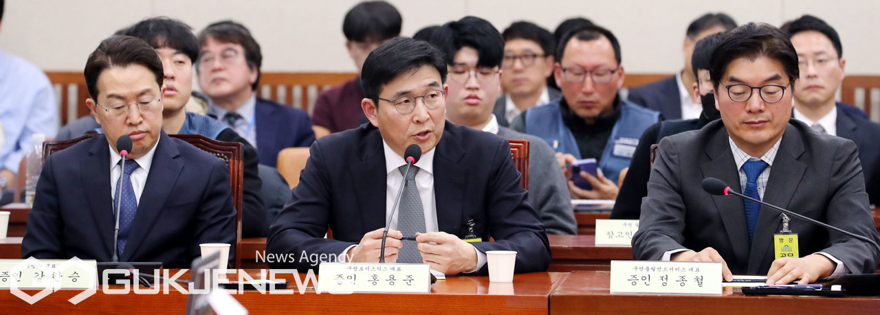 (서울=국제뉴스) 홍용준(오른쪽) 쿠팡로지스틱스서비스(CLS) 대표가 21일 서울 여의도 국회에서 열린 환경노동위원회의 쿠팡 택배노동자 심야노동 등 근로조건 개선을 위한 청문회에서 의원 질의에 답변하고 있다./사진=이용우기자