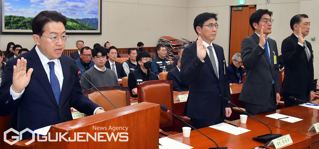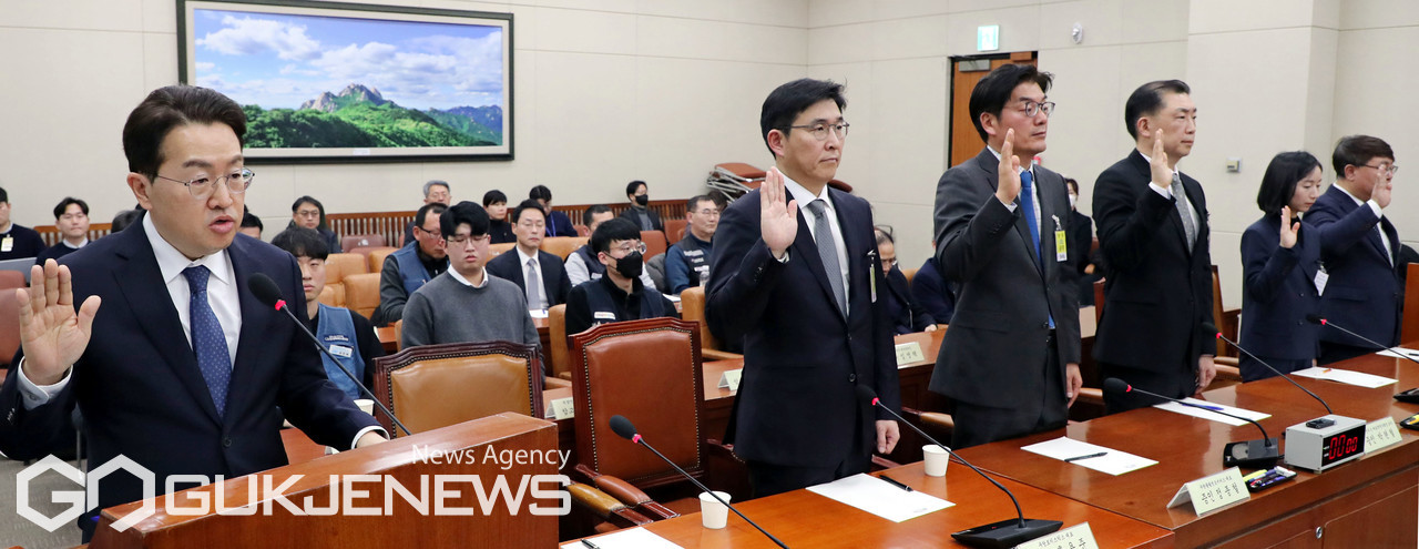 (서울=국제뉴스) 강한승 쿠팡㈜ 대표가 21일 오전 서울 여의도 국회 환경노동위원회에서 열린 쿠팡 택배노동자 근로 조건 개선·대유위니아그룹 임금체불 관련 청문회에서 증인 선서를 하고 있다./사진=이용우기자