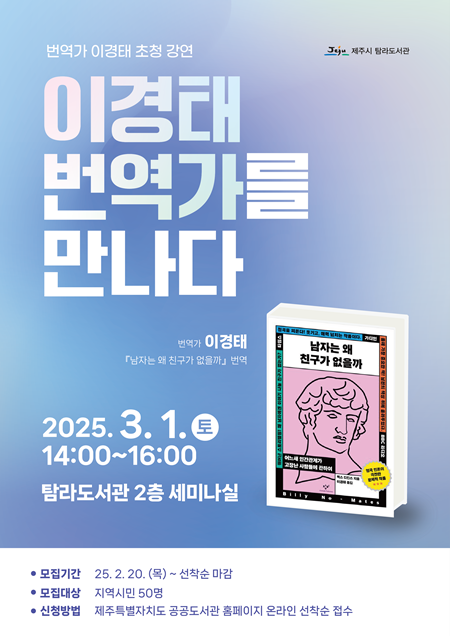 ‘이경태 번역가를 만나다’ 강연에 참여를 원하는 시민은 20일부터 제주특별자치도 공공도서관 누리집⇒행사/프로그램⇒도서관프로그램 신청을 통해 접수할 수 있으며, 기타 자세한 사항은 탐라도서관 으로 문의하면 된다.