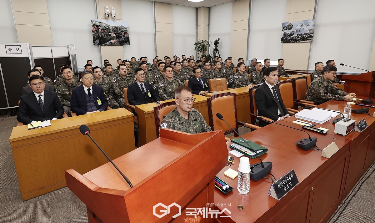 (서울=국제뉴스) 김선호 국방부 차관, 박안수 전 육군참모총장, 강호필 지상작전사령관이 21일 서울 여의도 국회에서 열린 윤석열 정부의 비상계엄 선포를 통한 내란 혐의 진상규명 국정조사특별위원회 전체회의에서 출석하고 있다. /사진=원명국 기자