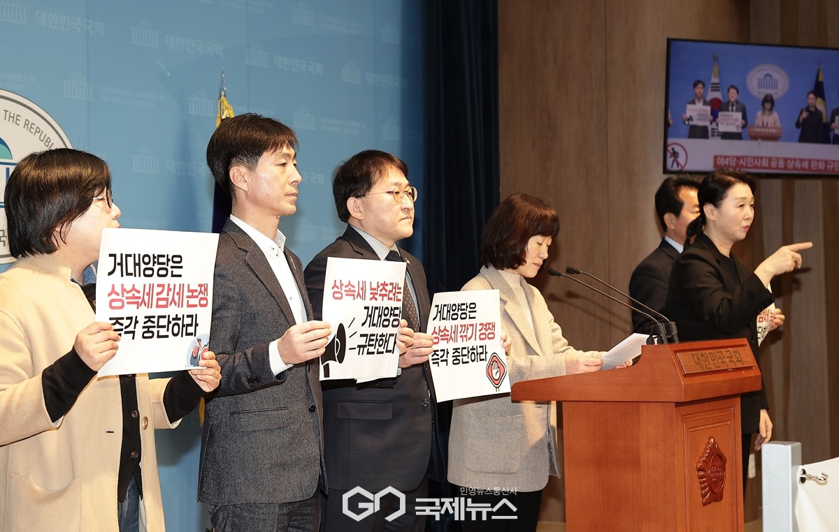 (서울=국제뉴스) 차규근 조국혁신당 의원, 윤종오 진보당 원내대표, 한창민 사회민주당 대표, 참여연대 및 민변 회원들이 27일 서울 여의도 국회 소통관에서 야4당-시민사회 공동 상속세 완화 규탄 기자회견을 하고 있다. /사진=원명국 기자