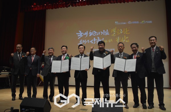 김태흠 지사는 27일 예산군청 추사홀에서 서정진 셀트리온그룹 회장, 최재구 예산군수, 김병곤 충남개발공사 사장과 투자합의각서(MOA)를 체결했다.