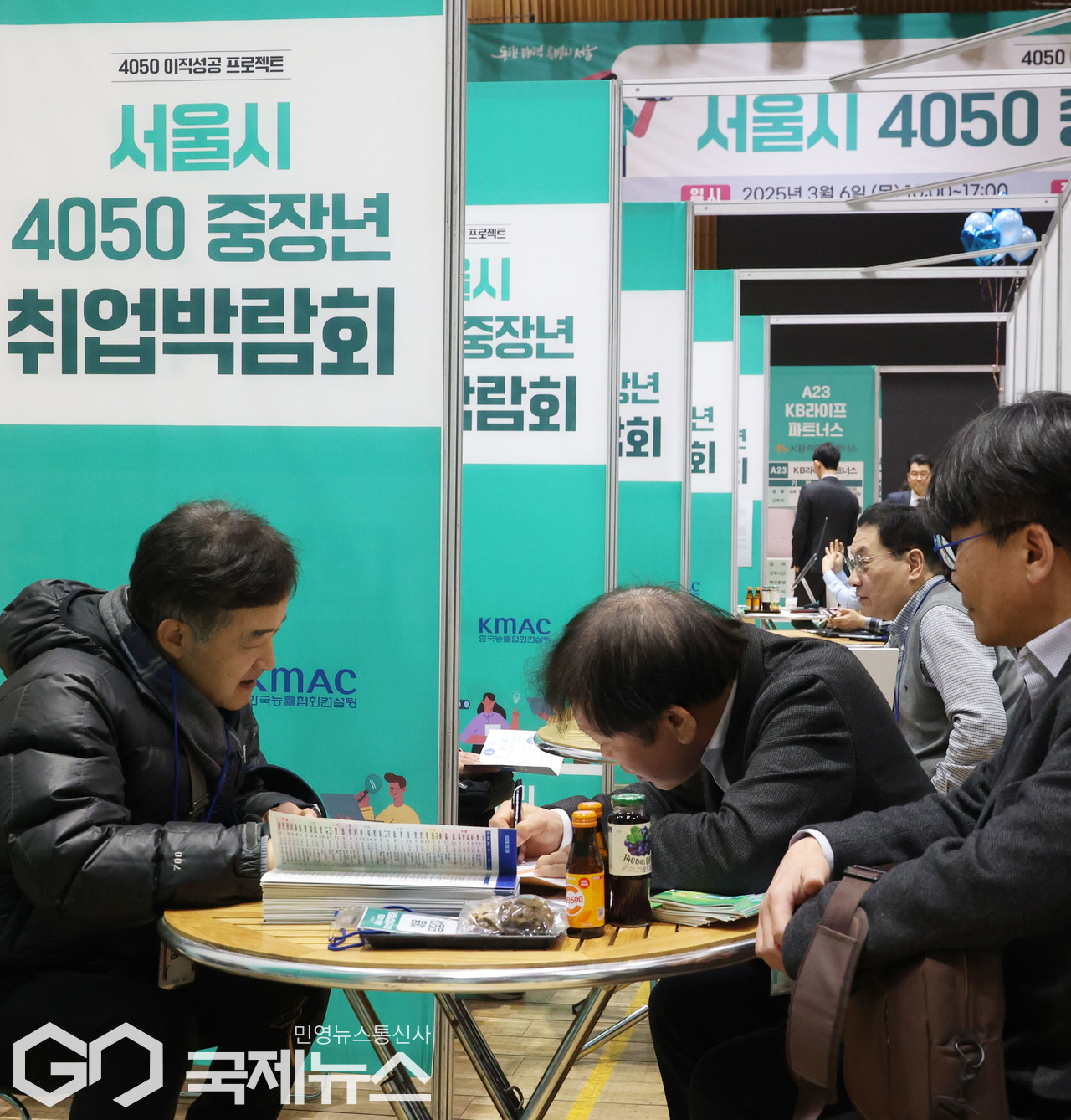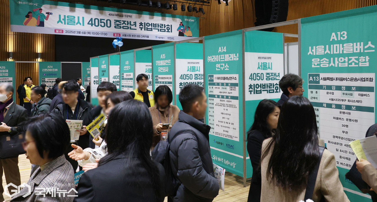 (서울=국제뉴스) '2025 서울시 4050 중장년 취업박람회'가 6일 오전 서울시청 다목적홀에서 개최된 가운데 구직자들이 일자리를 확인하고 있다. 이번 박람회에는 현대그린푸드·HY한국야쿠르트·신한라이프 등 중장년 채용을 희망하는 30여 개 기업이 참여해 중장년 구직자 450여 명을 채용할 예정이다./사진=이용우 기자