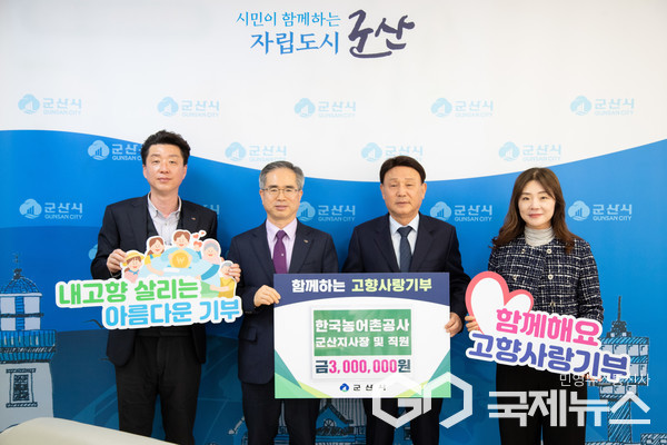 (군산=국제뉴스) 조판철 기자 = 군산시(시장 강임준)는 한국농어촌공사 군산지사(지사장 서기수)에서 지사장을 포함한 직원 30명이 고향사랑기부제로 군산시에 300만 원을 기부했다고 21일 밝혔다.