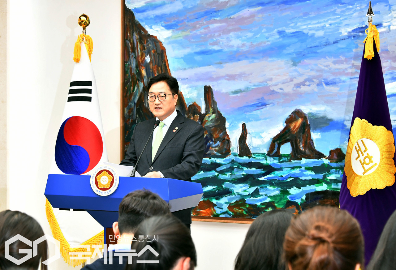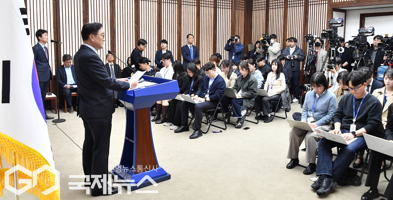 (서울=국제뉴스) 우원식 국회의장이 27일 오후 서울 여의도 국회에서 ‘마은혁 헌법재판관 후보자 임명과 헌재의 조속한 윤석열 대통령 탄핵심판 선고’를 촉구하는 담화문을 발표하고 있다./사진=이용우 기자