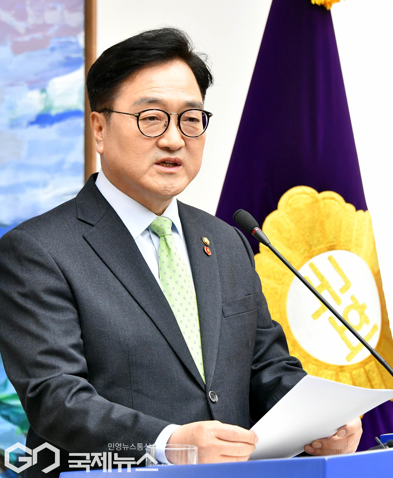 (서울=국제뉴스) 우원식 국회의장이 27일 오후 서울 여의도 국회에서 ‘마은혁 헌법재판관 후보자 임명과 헌재의 조속한 윤석열 대통령 탄핵심판 선고’를 촉구하는 담화문을 발표하고 있다./사진=이용우 기자