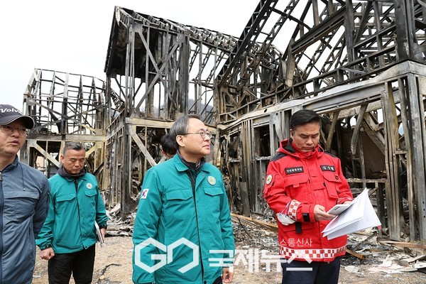 (의성=국제뉴스) 민웅기 기자 = 고기동 중앙재난안전대책본부장(행안부장관 직무대행)이 28일 오전 산불 피해를 입은 경북 의성군 단촌면 고운마을캠핑장 현장을 방문하여 피해 상황 등을 점검하고 있다.