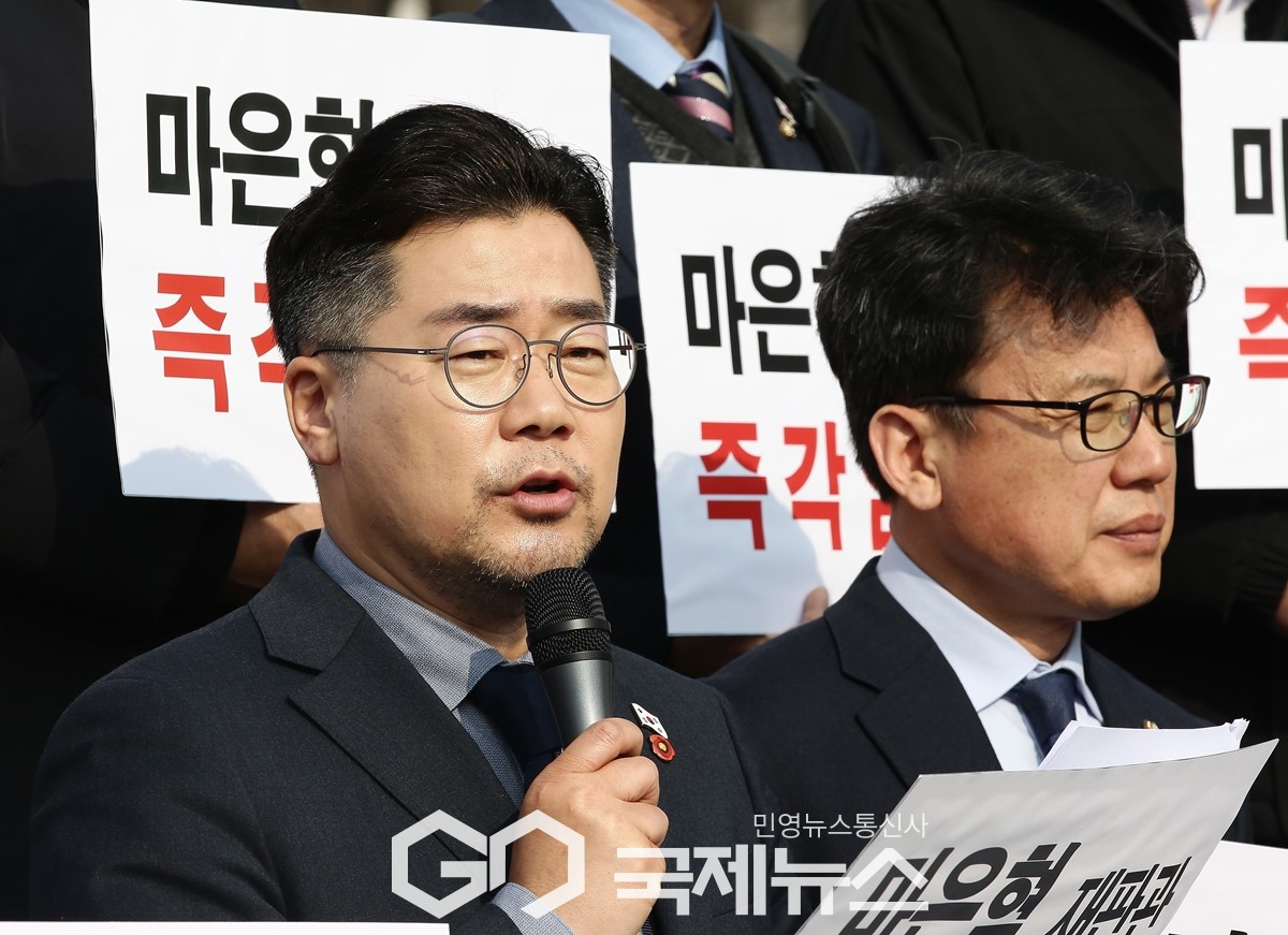 (서울=국제뉴스) 박찬대 더불어민주당 원내대표가 1일 서울 종로구 정부서울청사 앞에서 마은혁 헌법재판관 후보자 임명 촉구 긴급기자회견을 하고 있다. /사진=원명국 기자