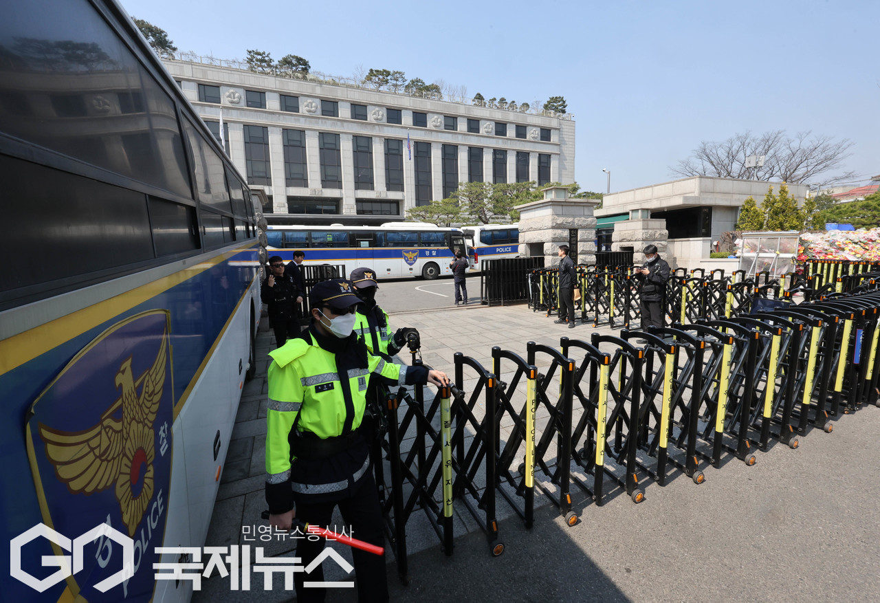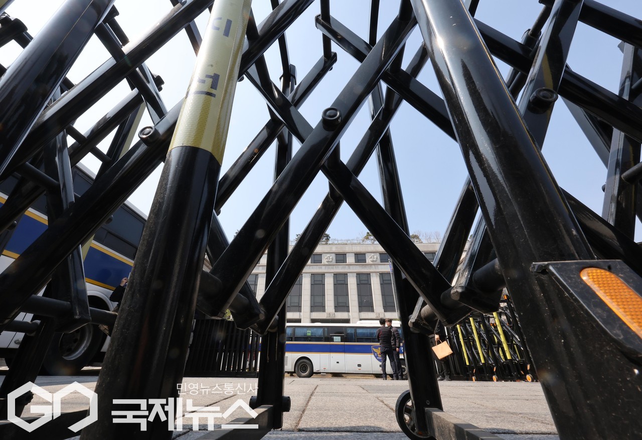 (서울=국제뉴스) 윤석열 대통령 탄핵 심판 선고가 오는 4일 오전 11시 이뤄지는 1일 오전 서울 종로구 헌법재판소 앞에서 경찰들이 근무를 서고 있다./사진=이용우 기자