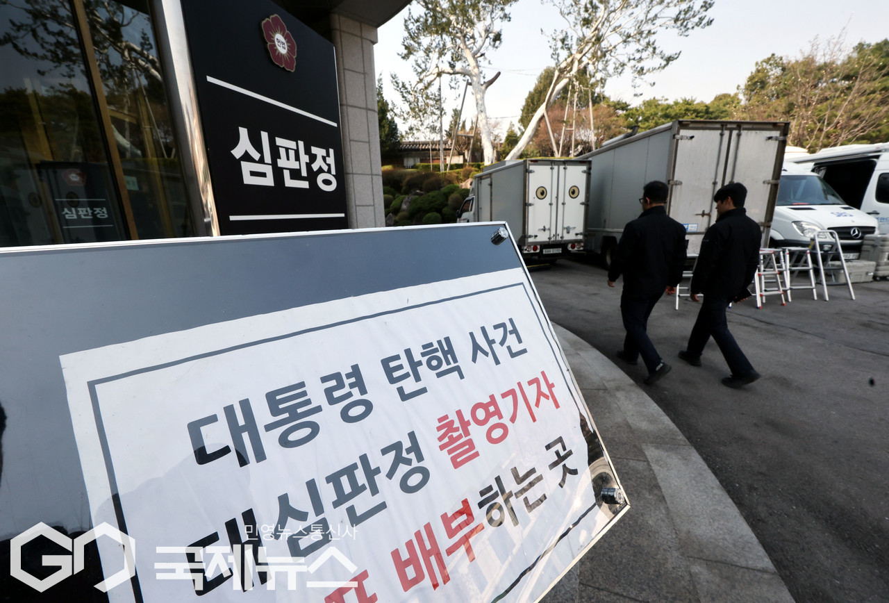 (서울=국제뉴스) 1일 서울 종로구 헌법재판소 심판정에 대통령 탄핵사건 관련 안내문이 붙어 있다.헌법재판소는 이날 오는 4일 오전 11시에 윤석열 대통령 탄핵 심판 선고기일을 진행한다고 밝혔다./사진=이용우 기자