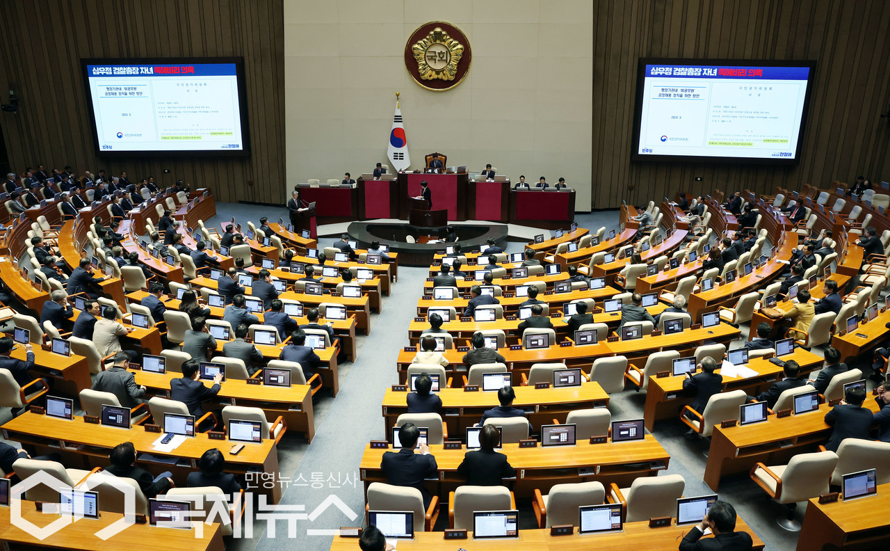 (서울=국제뉴스) 한정애 더불어미주당 의원이 3일 오후 서울 여의도 국회에서 열린 제423회 국회(임시회) 제4차 본회의 경북·경남·울산지역산불사태수습과피해대책마련및헌법질서수호를위한긴급현안질문에서 김홍균 외교부 제1차관이에게 심우정 검찰총장 자녀 채용비리 의혹 관련 질의를 하고 있다./사진=이용우 기자