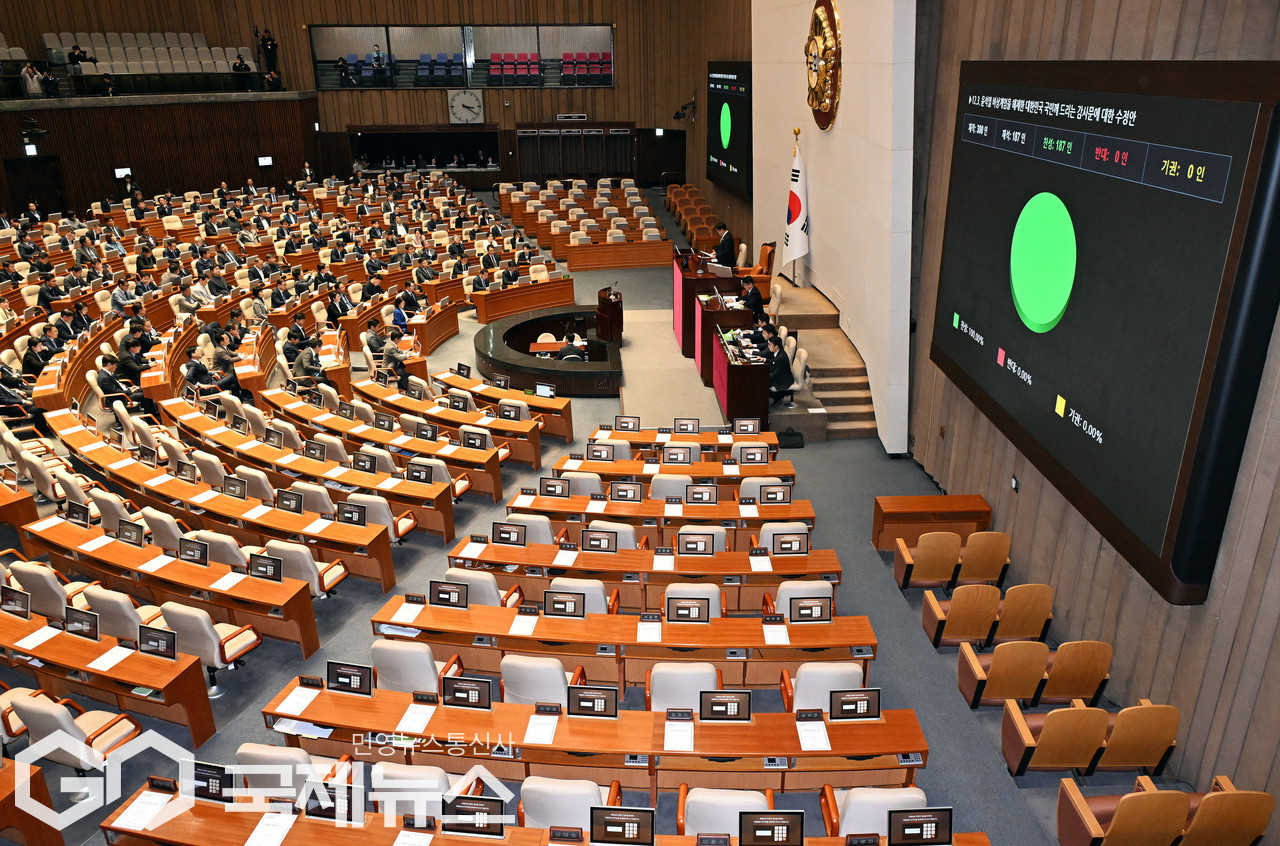 (서울=국제뉴스) 우원식 국회의장이 4일 오후 서울 여의도 국회에서 열린 제424회 국회(임시회) 제1차 본회의에서 윤석열 비상계엄을 해제한 대한민국 국민께 드리는 감사문에 대한 수정안 가결을 선포하며 의사봉을 두드리고 있다./사진=이용우 기자