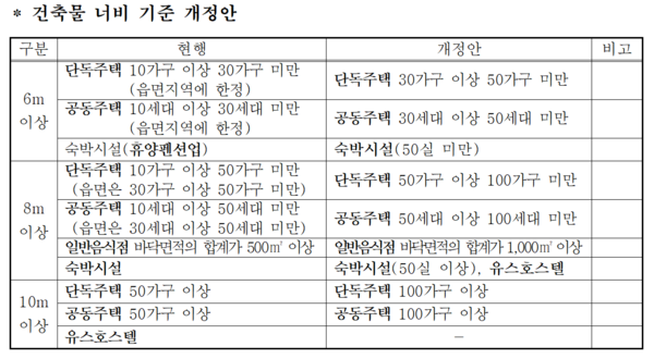 현재는 읍면지역에서 너비 6m 도로에 인접한 10세대 이상 30세대 미만 공공주택 건축을 허용하고 있지만, 앞으로는 지역과 관계없이 너비 6m 도로와 접하면 30세대 이상 50세대 미만 단독주택과 공동주택을 건설할 수 있고, 너비 8m 이상은 99세대까지 건축이 가능해진다.