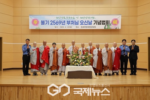 (속초=국제뉴스) 장덕진 기자 = 동해지방해양경찰청은 22일 '불기 2569년 부처님 오신 날'을 맞이해 경승위원(동해 삼화사 임법스님, 강릉 록유사 성인스님, 동해 만리사 도봉스님, 평창 월정사 지철스님)과 사찰·불자연합회 회원 등이 참석한 가운데 동해해경청 대강당에서 안전하고 평온한 동해바다를 기원하는 봉축 법회를 개최했다.