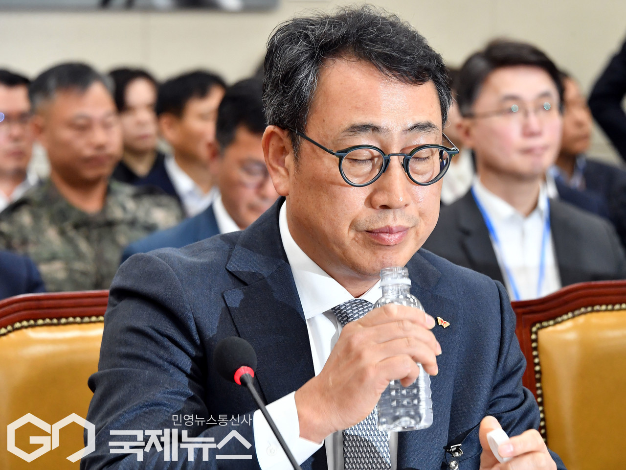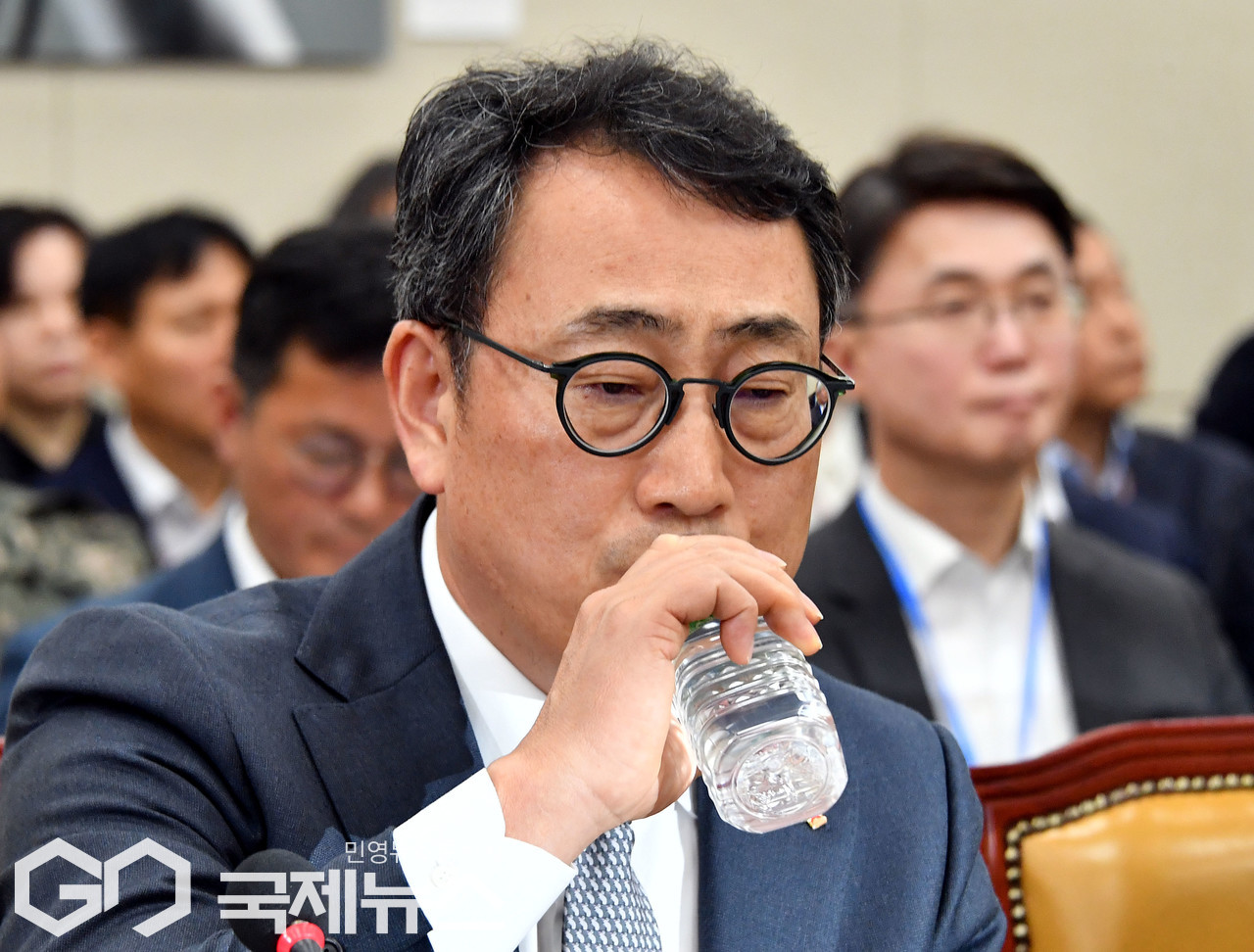 (서울=국제뉴스) 30일 오전 서울 여의도 국회에서 열린 과학기술정보방송통신위원회 전체회의 SKT해킹 및 YTN 등 방송통신분야 청문회에서 유영상 SKT텔레콤 사장이 물을 마시고 있다./사진=이용우 기자