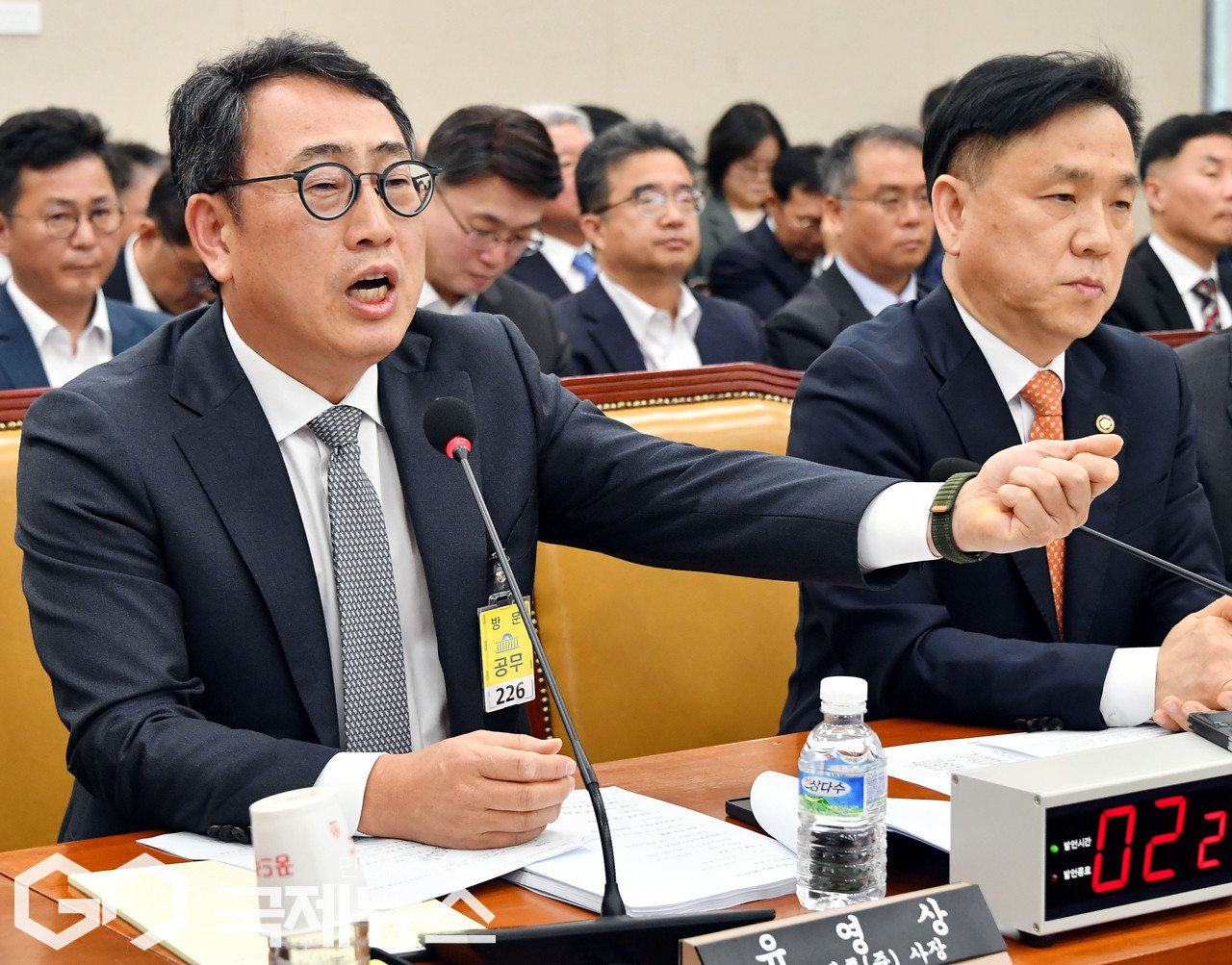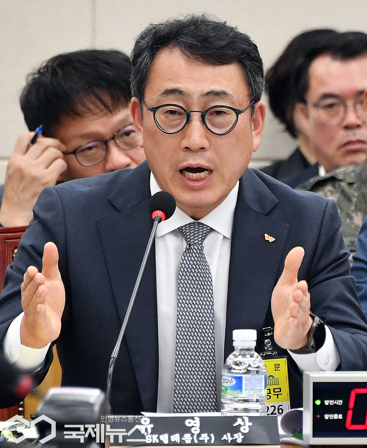(서울=국제뉴스) 30일 오전 서울 여의도 국회에서 열린 과학기술정보방송통신위원회 전체회의 SKT해킹 및 YTN 등 방송통신분야 청문회에서 유영상 SKT텔레콤 사장이 최근 유심 해킹사태에 따른 의원질의에 답하고 있./사진=이용우 기자