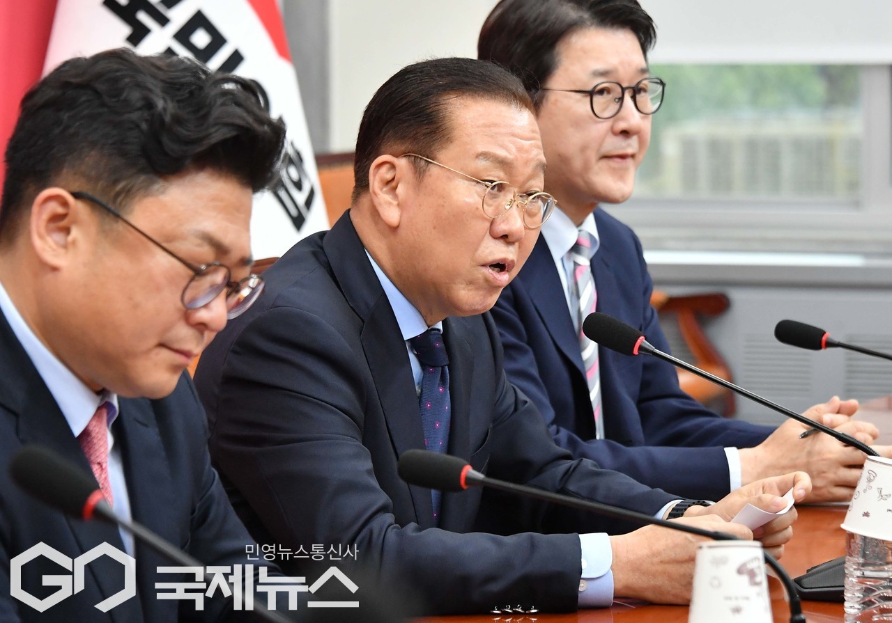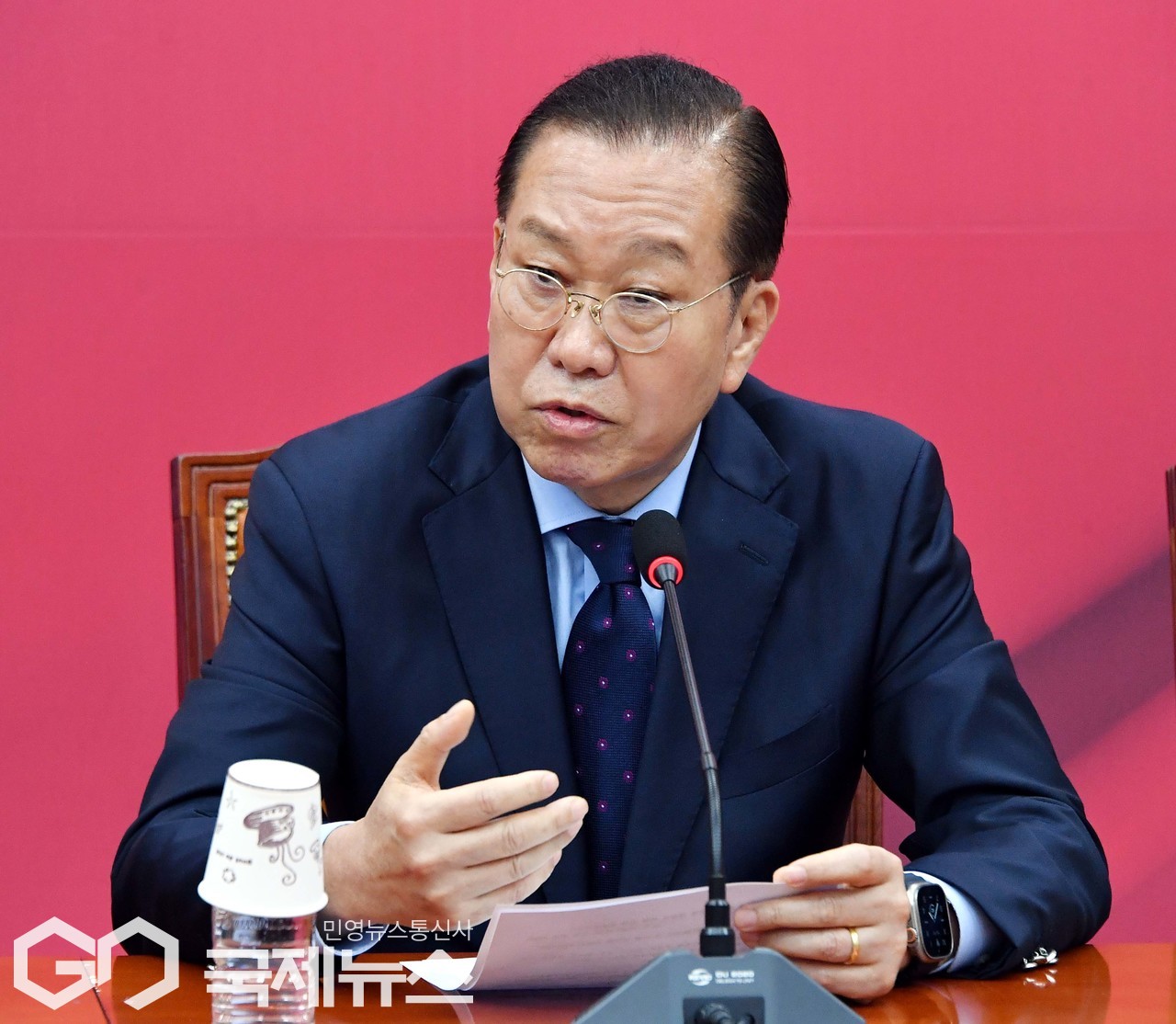 (서울=국제뉴스) 권영세 국민의힘 비상대책위원장이 1일 서울 여의도 국회에서 이재명 선거법 위반 대법원 파기환송 판결 관련 기자회견을 열고 발언하고 있다./사진=이용우 기자