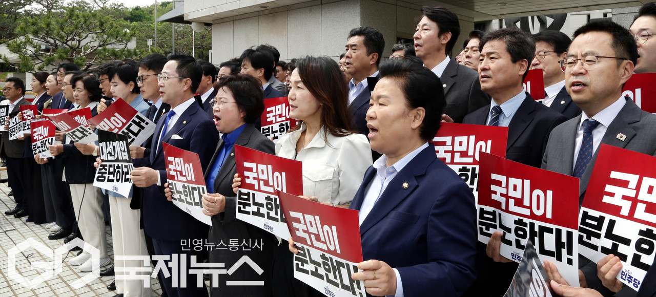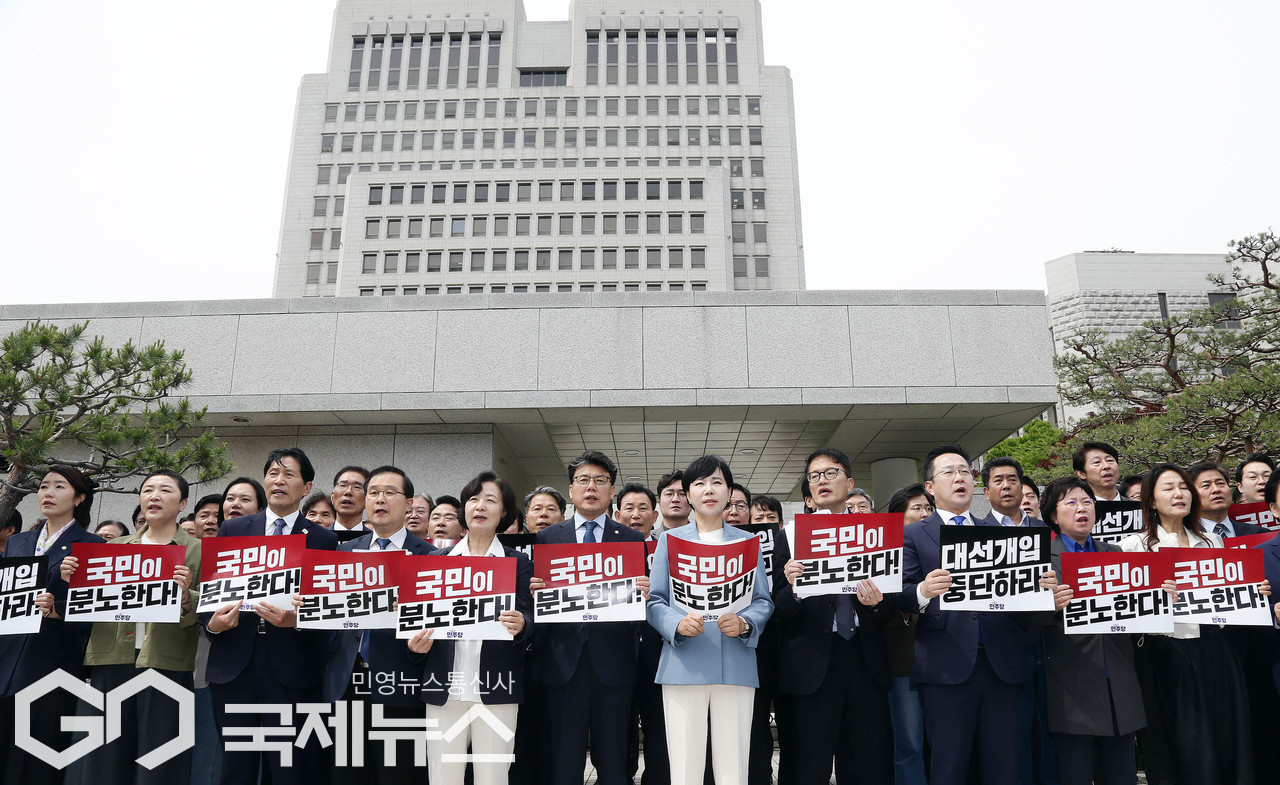 (서울=국제뉴스) 더불어민주당 의원들이 2일 오후 서울 서초구 대법원 앞에서 이재명 대선 후보의 공직선거법 위반 사건을 유죄 취지로 파기환송 판결한 것과 관련해 대법원 규탄 기자회견을 하고 있다./사진=이용우 기자