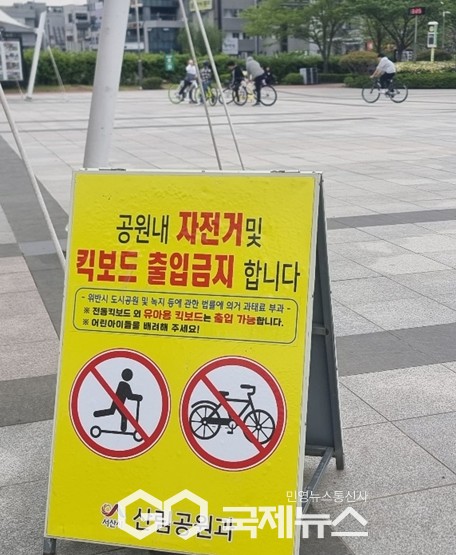 (서산=국제뉴스) 백승일 기자 = 6일 충남 서산시 소재 서산중앙호수공원 원형광장에 설치된 공원 출입 금지 안내 표지판에 자전거 출입 금지가 안내 돼 있지만 관리자가 없어 자전거들의 출입을 막지 못하고 있다.