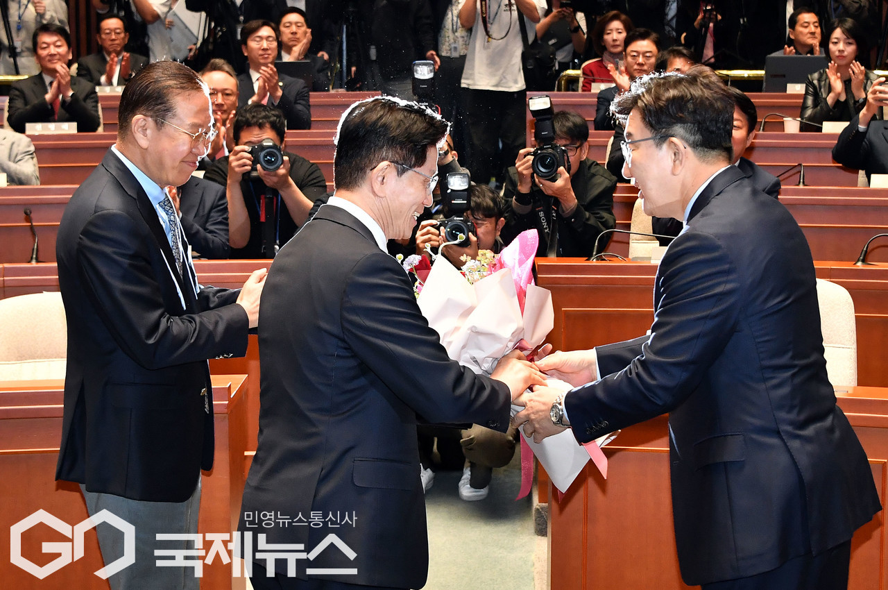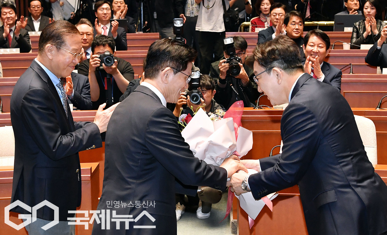 (서울=국제뉴스) 김문수 국민의힘 대선 후보가 9일 오전 서울 여의도 국회에서 열린 의원총회에서 권영세 비상대책위원장과 권성동 원내대표에게 꽃다발을 받고 있다./사진=이용우 기자