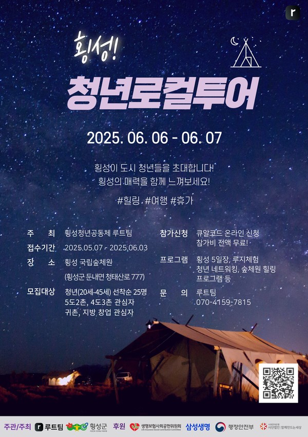 이번 행사는 지역청년지원사업(Boost Your Local)의 일환으로 지방소멸 위기속 청년 유입의 돌파구로 기획돼 횡성청년공동체 루트팀(대표 유상연,이종무)이 주최하고 생명보험사회공헌위원회, 삼성생명, 행정안전부, 사단법인 함께만드는세상이 후원한다.
