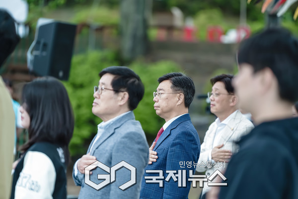 (성남=국제뉴스) 손창민 기자 = 신상진 성남시장이 19일 오후 1시 경기 성남시 수정구 동서울대학교 소운동장에서 열린 2025년 성년의날 기념식에 참석해 국기에 경례하고 있다.
