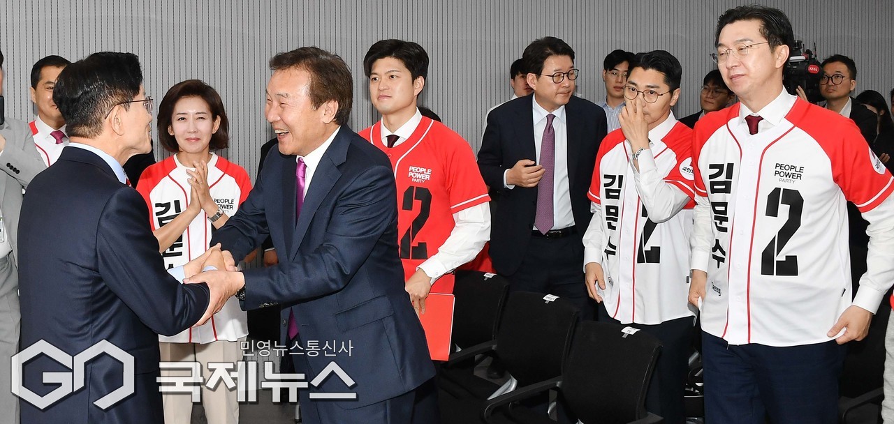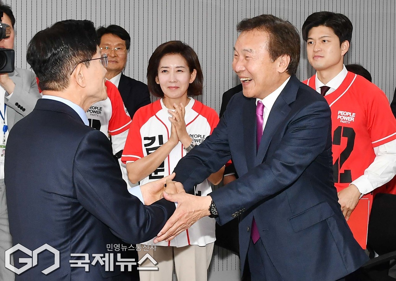(서울=국제뉴스) 김문수 국민의힘 대선후보가 22일 오전 서울 여의도 국민의힘 중앙당사에서 정치개혁 관련 긴급 기자회견을 마치고 손학규(오른쪽) 전 바른미래당 대표와 악수하고 있다./사진=이용우 기자