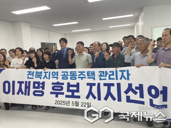 (전북=국제뉴스) 김종빈 기자 =더불어민주당 공동선거대책위원장인 한준호 골목 골목 전북선거대책위원장이 22일 오후1시10분 전주 전북지역 공동주택 관리자 200여명이 가운데 더불어민주당 이재명후보 지지선언에 참석 전북도민의 압도적인 지지를 호소 했다.