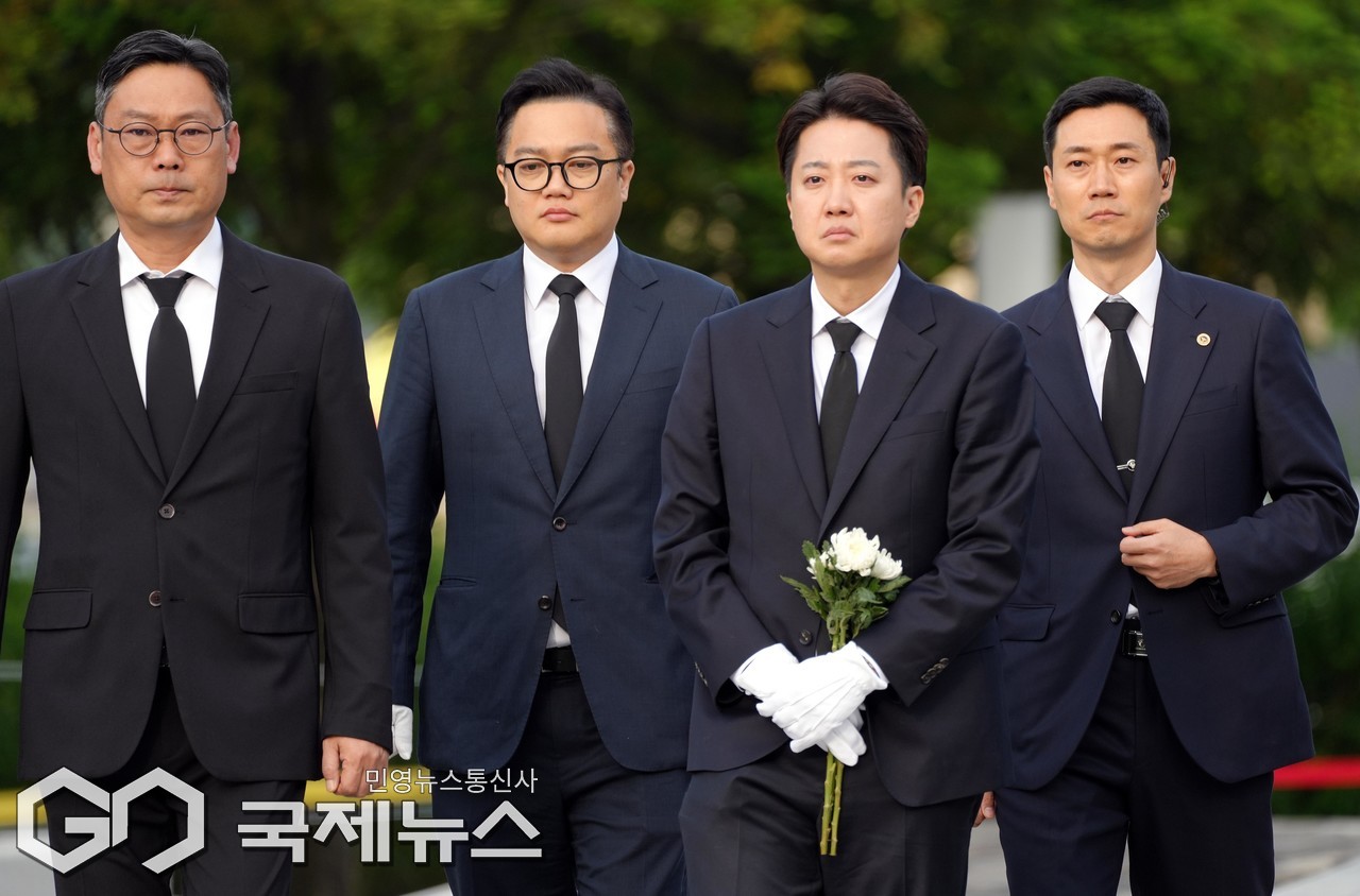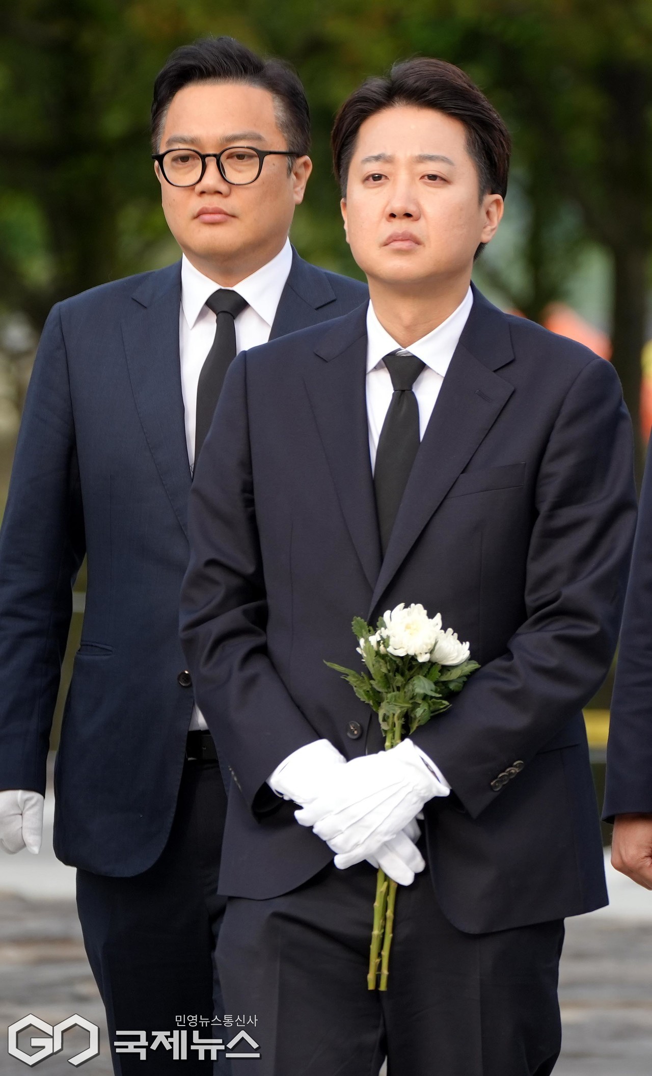 (김해=국제뉴스) 이준석 개혁신당 대통령 후보가 고 노무현 전 대통령 16주기인 23일 오전 경남 김해시 봉하마을 노 전 대통령 묘역을 찾아 참배하고 있다./사진=(개혁신당 제공)