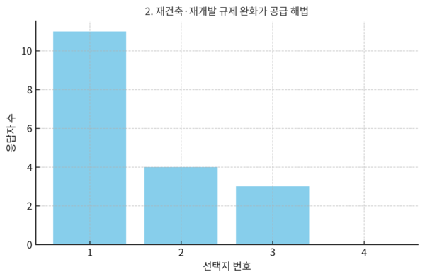 18명 중 11명이 선택. 반면 공공 주도 신규 택지 개발은 4명에 불과. “규제를 풀되, 인허가 속도와 금융 유연성도 함께 풀어야 한다”는 조건부 지지.