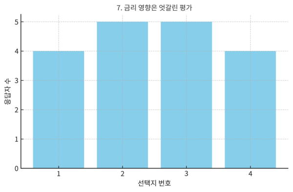 정확히 의견이 분산. 5명은 "단기적 영향", 4명은 "정책·공급이 더 큰 변수", 5명은 "장기적으로 영향 없음", 4명은 "수요 억제 효과"로 답해 전문가마다 금리 영향력에 대한 시각차가 뚜렷.