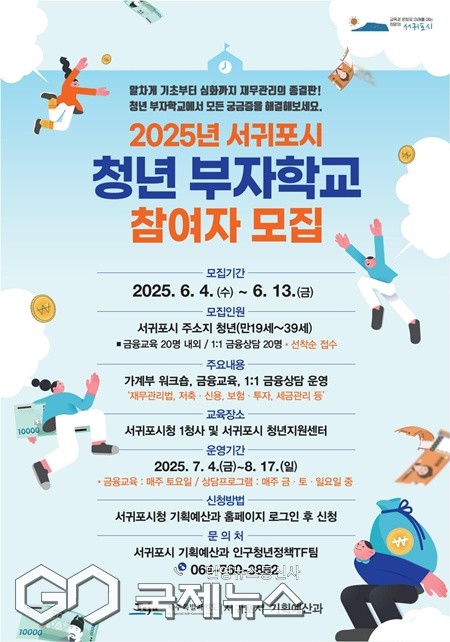 (제주=국제뉴스) 문서현 기자 = 서귀포시는 ‘청년이 생각하고, 청년이 요구하는, 청년행복 서귀포시’의 일환으로 청년의 경제적 역량 강화를 위한 '2025년 서귀포시 청년 부자학교' 참여자를 모집한다고 밝혔다.