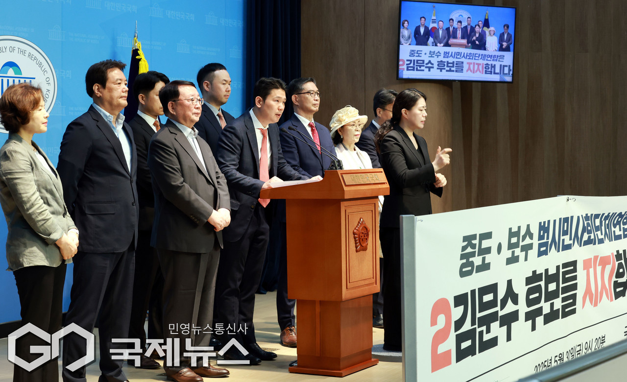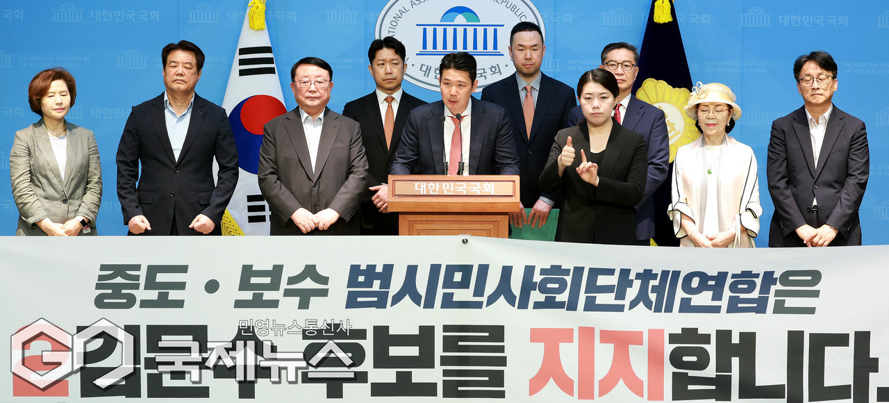 (서울=국제뉴스) 범시민사회단체연합이 30일 오전 서울 여의도 국회 소통관에서 국민의힘 김문수 대선후보 지지선언 기자회견을 하고 있다. ./사진=이용우 기자