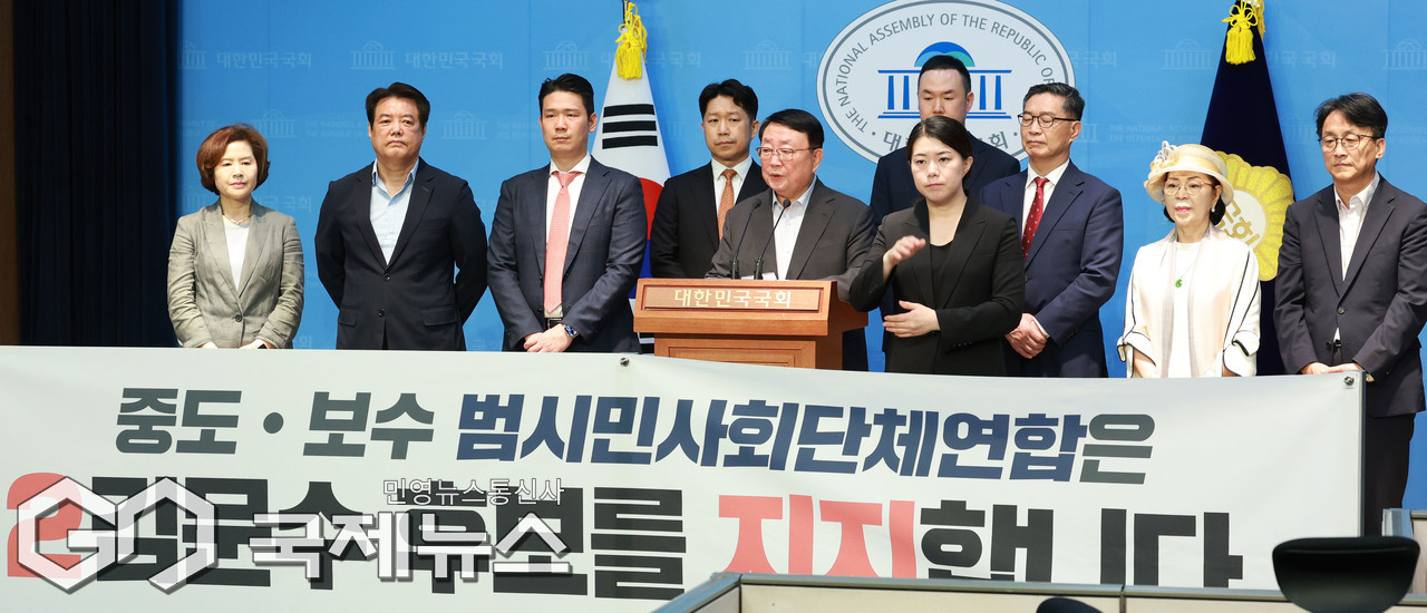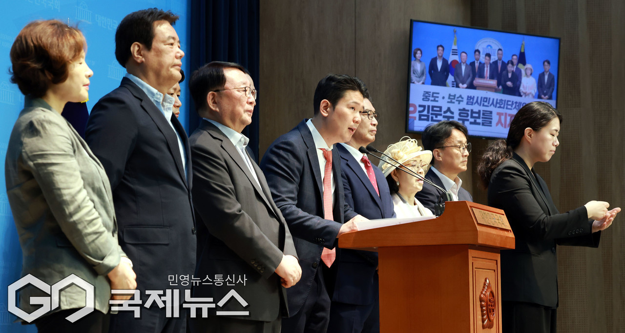 (서울=국제뉴스) 범시민사회단체연합이 30일 오전 서울 여의도 국회 소통관에서 국민의힘 김문수 대선후보 지지선언 기자회견을 하고 있다. ./사진=이용우 기자