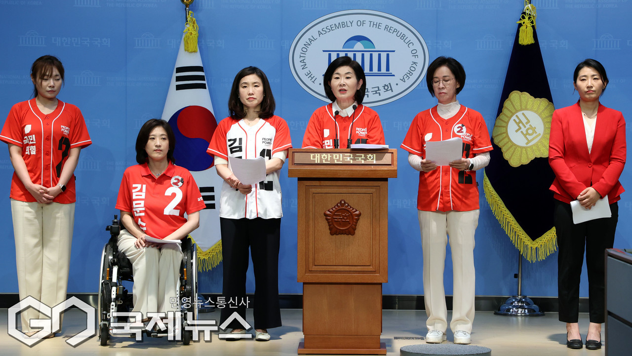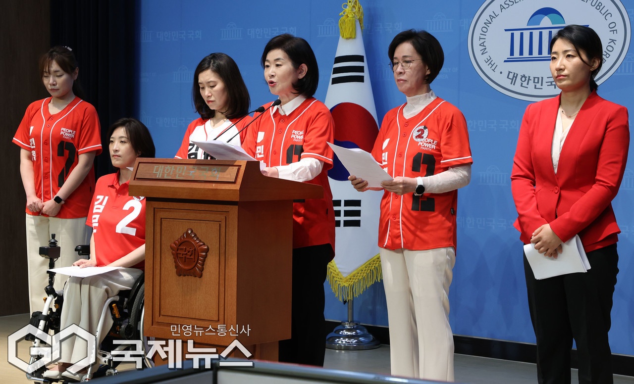 (서울=국제뉴스) 국민의힘 중앙선대위 여성본부 및 여성의원들이 30일 오후 서울 여의도 국회 소통관에서 열린 유시민 작가 발언 규탄 기자회견에서 유시민 씨의 김문수 후보 배우자 설난영 여사를 향한 조롱과 비하 발언을 강력히 규탄 하고 있다./사진=이용우 기자