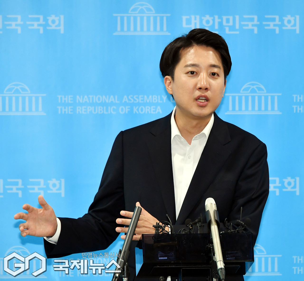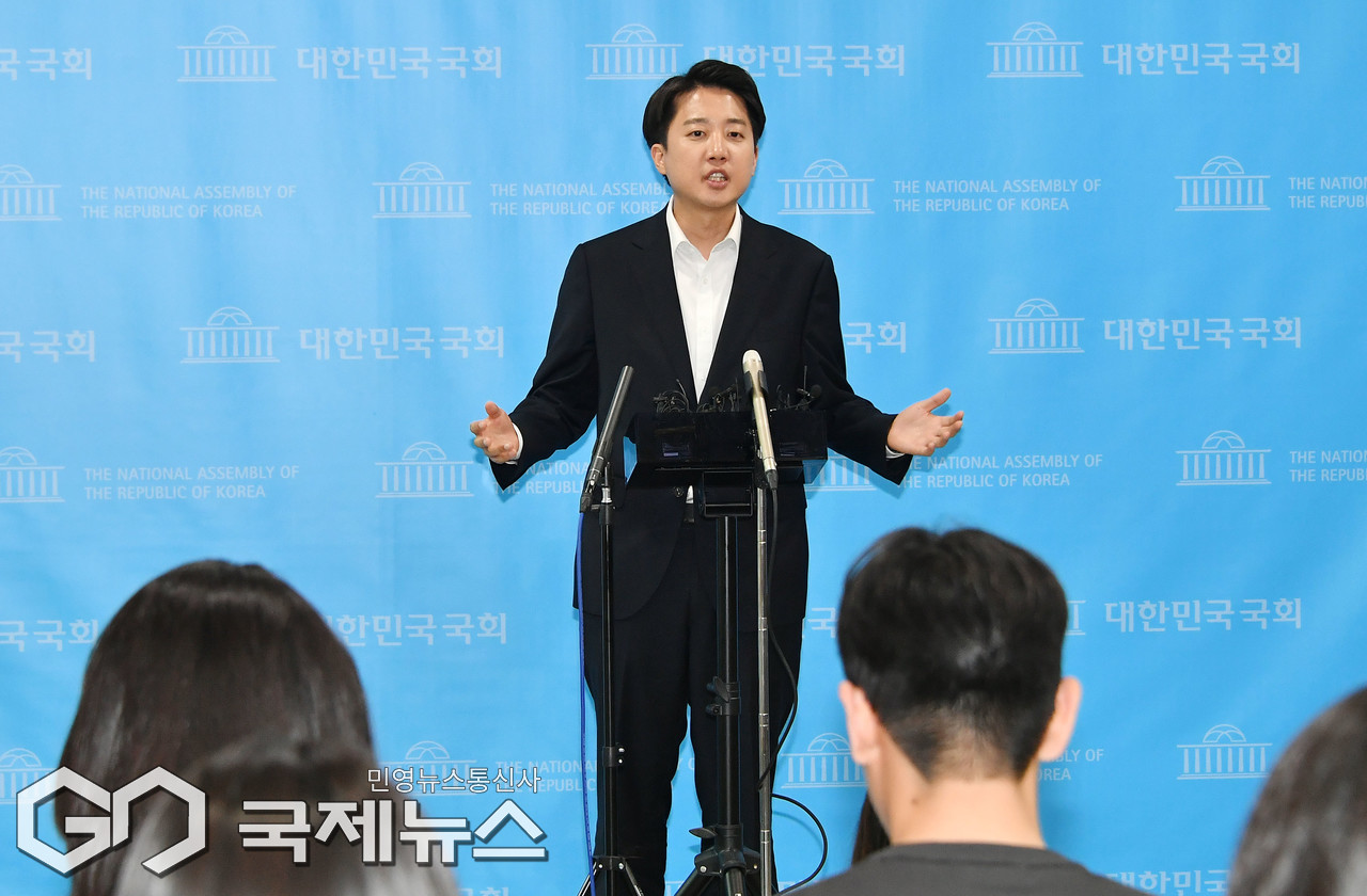 (서울=국제뉴스) 이준석 개혁신당 대통령 후보가 30일 오후 서울 여의도 국회 소통관에서 민주당, 조국혁신당, 진보당, 기본소득당, 사회민주당 의원들이 자신을 국회에서 제명시키는 징계안을 제출한 것과 관련 긴급 기자회견을 한 뒤 취재진 질문에 답하고 있다./사진=이용우 기자