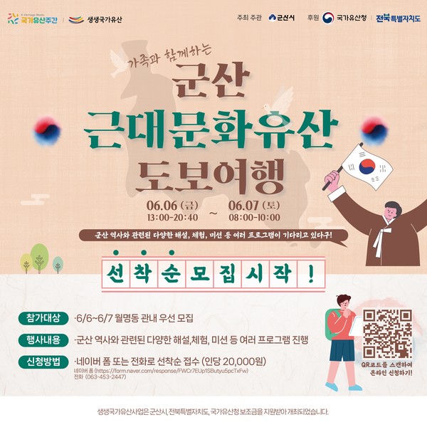 이번 프로그램은 6월 6일부터 6월 7일까지 1회 운영되며, ‘국가유산청 생생 국가유산 사업’의 하나로 진행된다. 참가자는 군산의 대표적인 근대 문화유산을 도보로 탐방하며 역사와 문화를 체험할 수 있다.