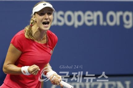 Sep 6, 2015; New York, NY, USA; Ekaterina Makarova of Russia react safter winning a point against Kristina Mladenovic of France (not pictured) on day seven of the 2015 U.S. Open tennis tournament at USTA Billie Jean King National Tennis Center