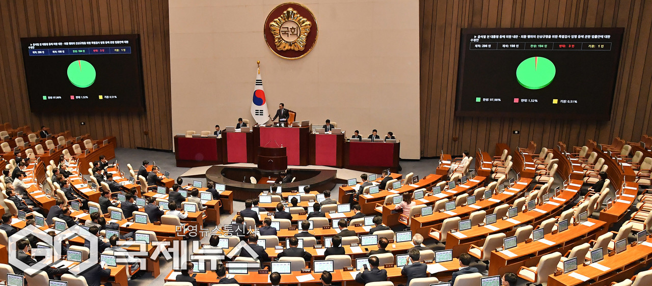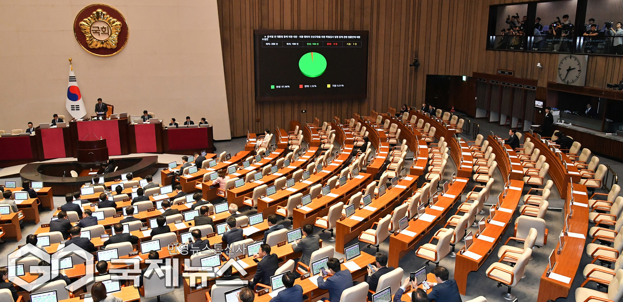 (서울=국제뉴스) 5일 서울 여의도 국회에서 열린 제426회 국회(임시회) 제1차 본회의에서 윤석열 내란 진상규명 특검법 수정안이 통과되고 있다./사진=이용우 기자