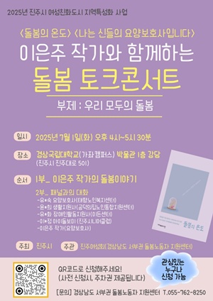 (진주=국제뉴스) 정천권 기자 = 경남 서부권돌봄노동자지원센터(센터장 박혜정)는 오는 7월1일 오후 4시부터 5시30분 경상국립대학교(가좌캠퍼스)박물관 1층 강당에서 ‘이은주 작가와 함께하는 돌봄 토크콘서트’를 개최한다.