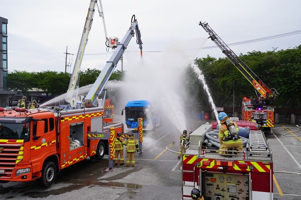(제주=국제뉴스) 문서현 기자 = 제주소방서(서장 전철하)는 지난 12일 금남여객 차고지에서 특수소방차량을 활용한 전기버스 화재 대응 훈련을 실시했다.