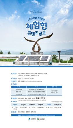 (인천=국제뉴스) 이병훈 기자 = 인천시와 인천관광공사는 인천의 대표적인 평화 관광지를 널리 알리고, 새로운 관광 수요를 창출하기 위한 ‘2025 인천 평화관광 체험형 콘텐츠 공모전’을 7월 2일부터 20일까지 개최한다.