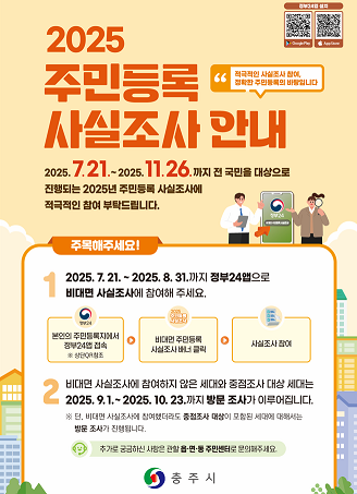 (충주=국제뉴스) 김상민 기자 = 충북 충주시는 지역 주민을 대상으로 오는 11월 26일까지 '2025년 주민등록 사실조사'를 실시한다고 22일 밝혔다.